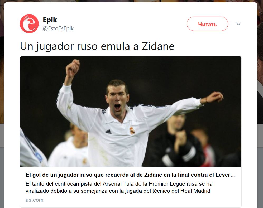 Испанское издание AS сравнили гол тульского полузащитника с ударом Зинедина Зидана в матче 2002-го года.