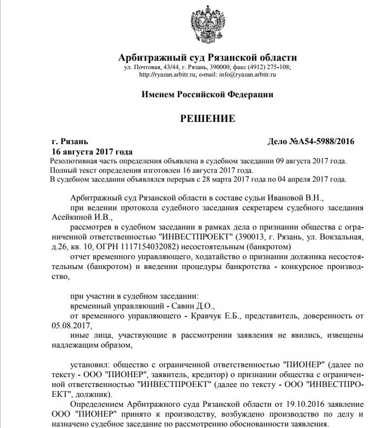 В начале августа Рязанским арбитражным судом было принято решение о признании ООО «ИНВЕСТПРОЕКТ» банкротом.