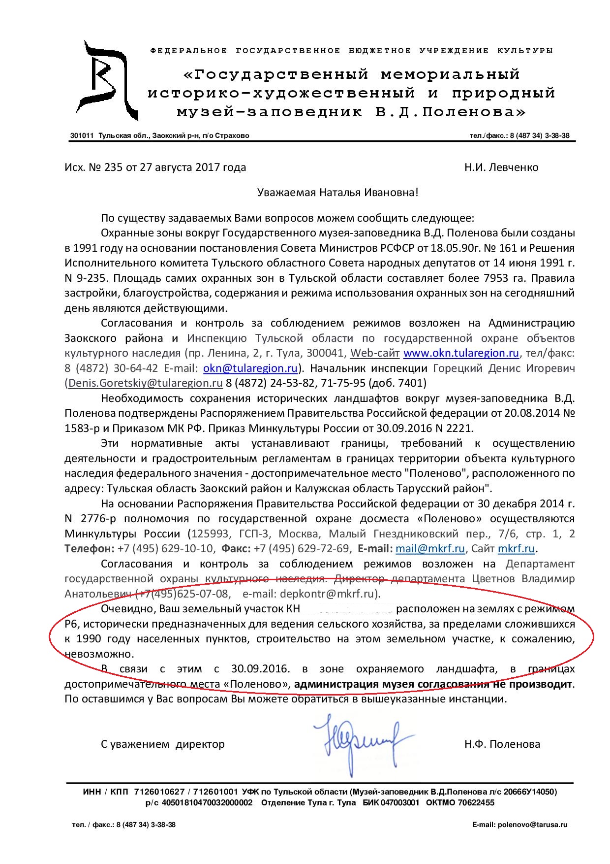 — Я решила убедиться в этом сама и обратилась с заявлениями: в администрацию МО Страховское, администрацию Заокского района, прокуратуру Заокского района, администрацию музея Поленово и в Инспекцию по госохране объектов культурного наследия Тульской области, — рассказывает Наталья. —  Получила ответы, которые все как один похожи, но самый важный для меня ответ был от начальника Инспекции по госохране объектов культурного наследия  — господина Горецкого. Из письма от него я поняла, что ничего ни строить, ни регистрировать мне, действительно, нельзя.