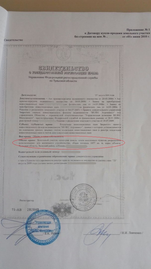 Москвичка Наталья Левченко рассказала нам, что свой земельный участок, расположенный в близлежащей деревеньке Искань, она приобрела в 2010-м году у компании «Велес Менеджмент». Участок представляет собой территорию в  800 квадратных метров категории земель, на которых разрешено жилищное строительство. Об этом свидетельствует документ, выданный в администрации Заокского района.