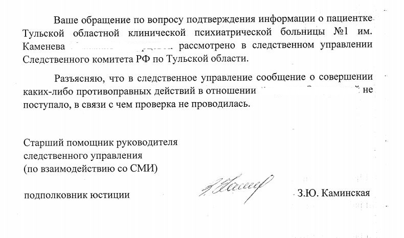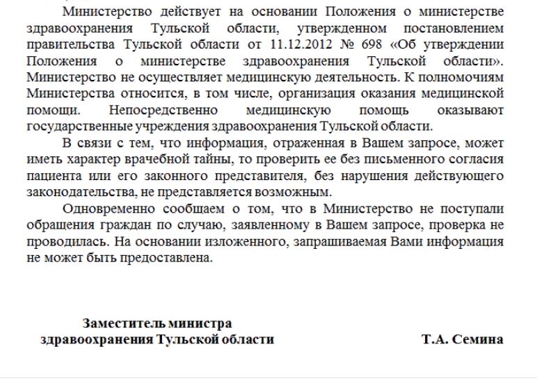 Далее, во-вторых, мы обратились за разъяснениями в министерство здравоохранения Тульской области. Там нам, в общем-то, ожидаемо ответили, что информация не может быть предоставлена в полной мере, так как является врачебной тайной. Кроме того, заместитель министра Татьяна Семина уточнила: обращений от граждан по этому случаю к ним не поступало, проверка не проводилась.