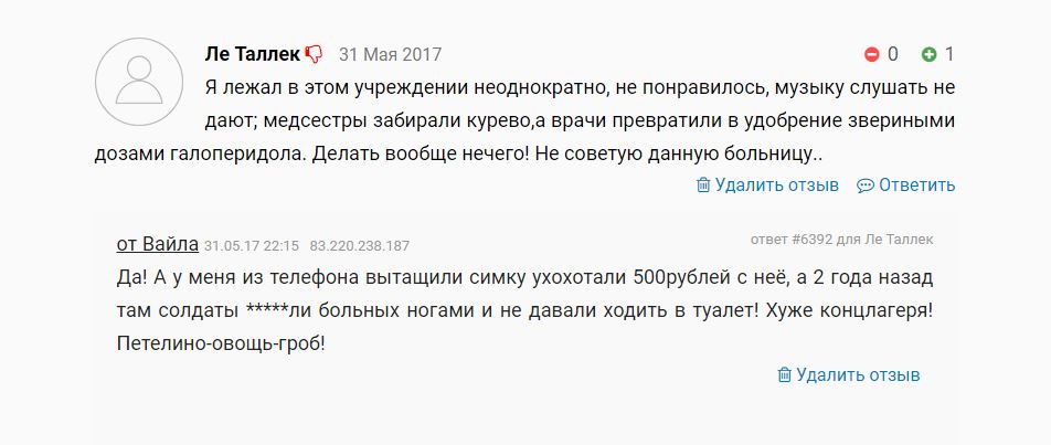 Хотелось бы верить, что эти явно негативные комментарии о положении в руководимой Лосевым психбольнице — не являются мнением реальных пациентов. Но есть и другой вариант. Возможно, описанные события — правда, которую удается утаивать от общественности и СМИ.