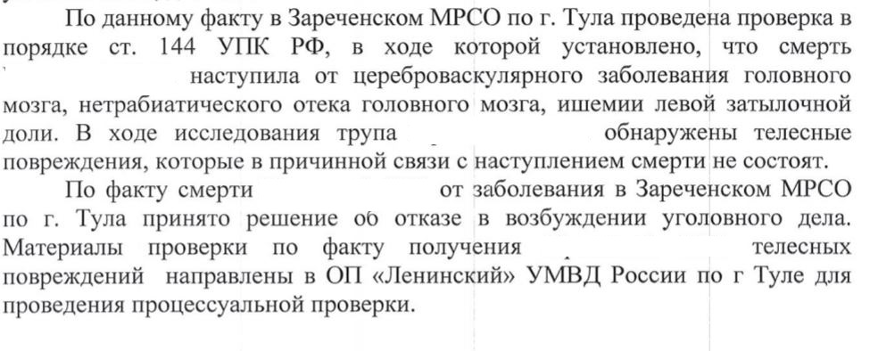 «Тульская пресса» получила ответ от пресс-службы СУ СКР по факту гибели пациентки психиатрической больницы им. Каменева.