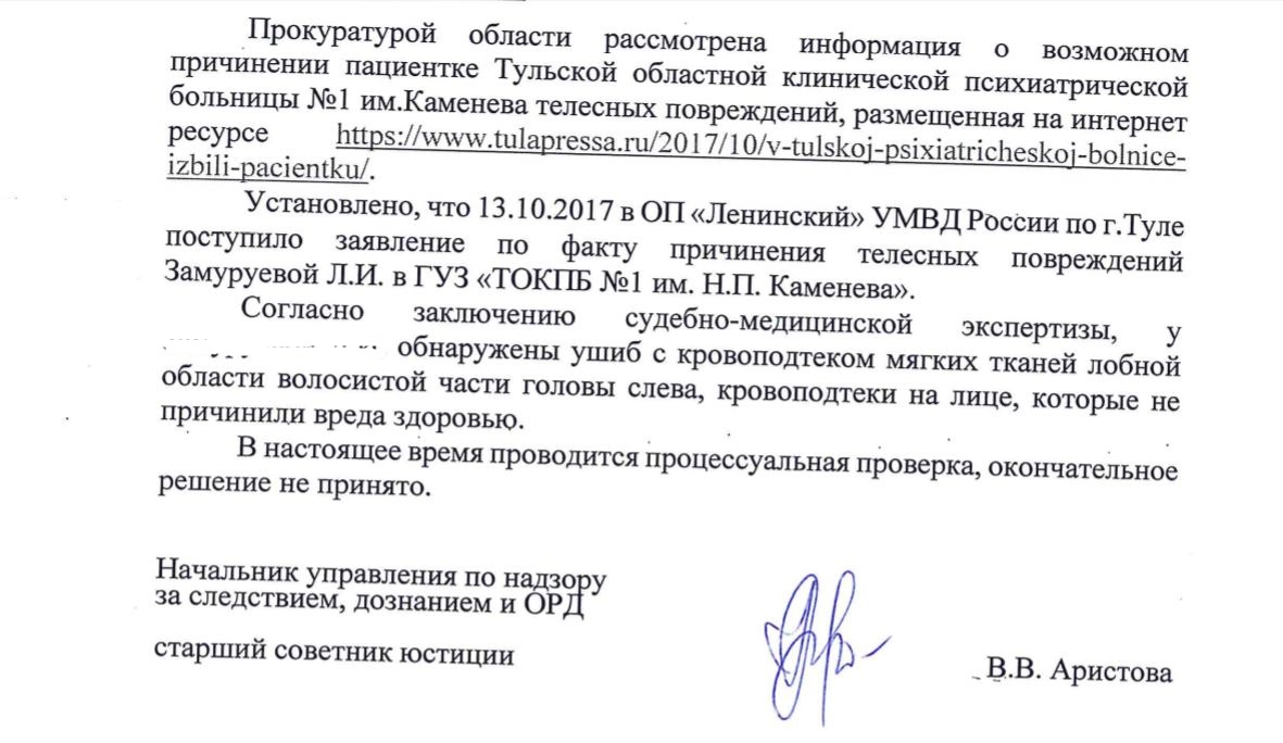 ИА «Тульская пресса» сообщала ранее о случае с пациенткой, получившей ушиб во время нахождения в стационаре филиала Каменевской психиатрической больницы в Маслово.