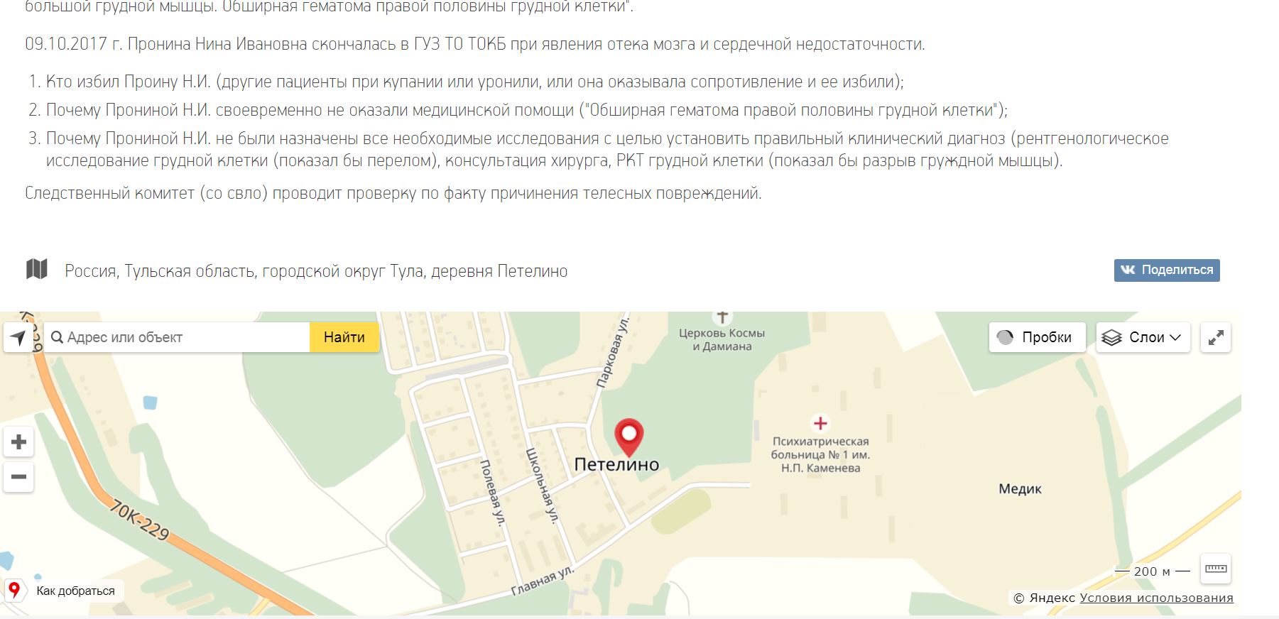 На сайте Zadolbalo разместили информацию о пациентке Тульской областной психиатрической больницы им. Каменева, которая скончалась после ушиба грудной клетки.