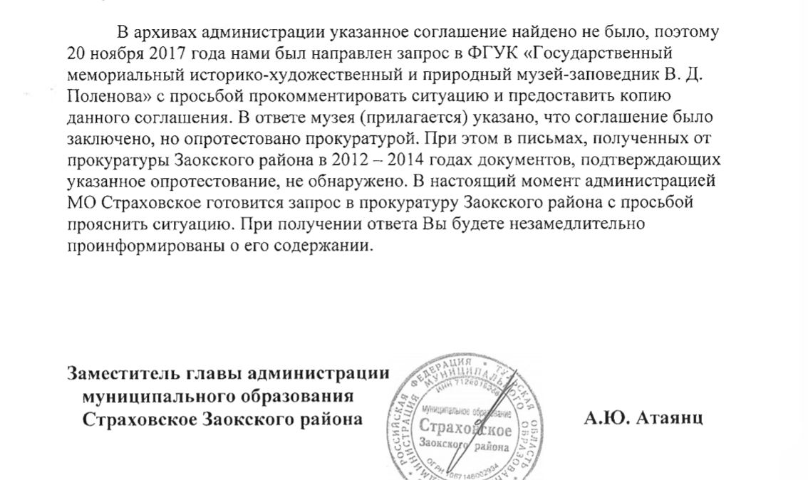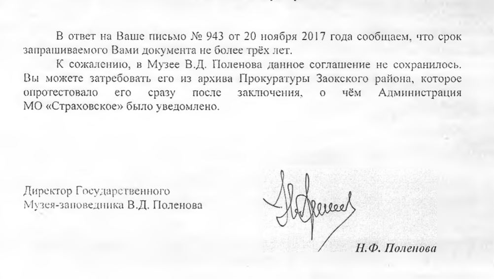 Сотрудники музея-заповедника «Поленово» пояснили, что Соглашение было сразу же после заключения опротестовано прокуратурой, и, наверняка, копию документа можно найти там.