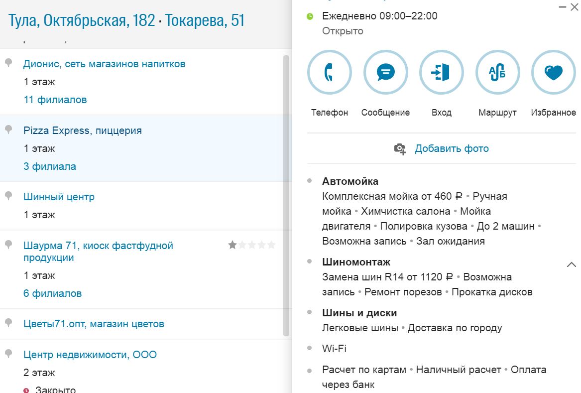 По сведениям из справочника, в здании располагается Шинный центр, который на самом деле является не только развернутым автосервисом, но и автомойкой.
