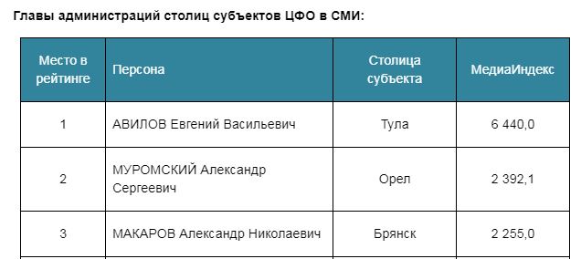 Компанией «Медиалогия» подготовлен медиарейтинг среди глав администраций столиц субъектов ЦФО, в котором первое место получил сити-менеджер Тулы Евгений Авилов.