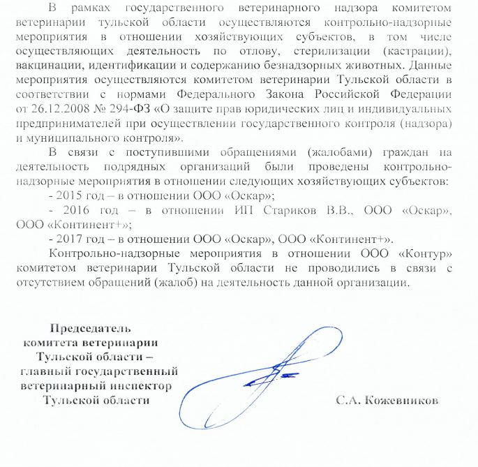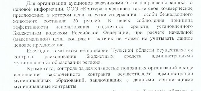 Тем не менее подтверждений этому, кроме слов наших читателей, мы не имеем. Но зато у нас есть официальный ответ от комитета на запрос председателю Сергею Кожевникову. Мы попросили его разъяснить, как же обстоят дела с тендерами, кто их заключал, Проводились ли проверки относительно фирмы «Континент+» и «Контура», который предлагает кормить животных на эти несчастные 26 рублей. Страшно думать, что эти деньги могут просто-напросто попасть в чей-то карман, потому что «протянуть» долго на таком пайке все равно не выйдет. А также мы попросили самого Сергея Александровича ответить нам, считает ли он адекватной данную сумму?