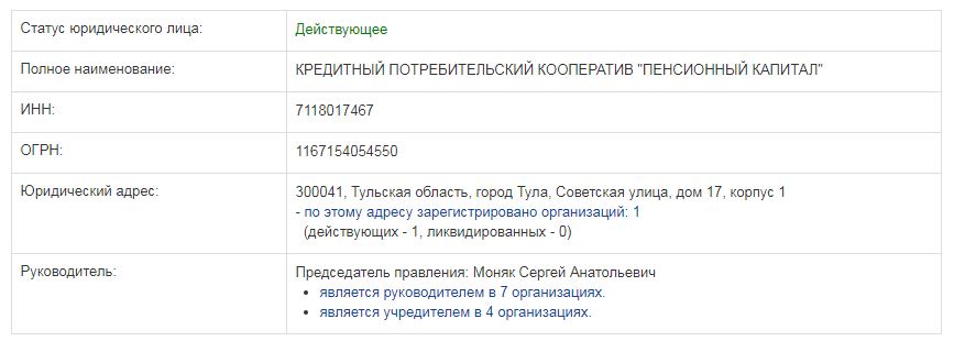 Кредитный потребительский кооператив «Пенсионный капитал», пайщики которого остались без денег и не могут найти руководителя организации, все еще числится действующей фирмой в реестре ЕГРЮЛ.