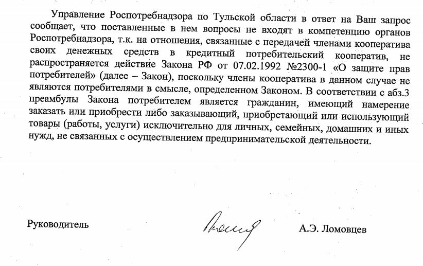 «Тульская пресса» получила ответ от руководителя Управления Роспотребнадзора по Тульской области Александра Ломовцева по поводу закрытия офиса КПК «Пенсионный капитал».