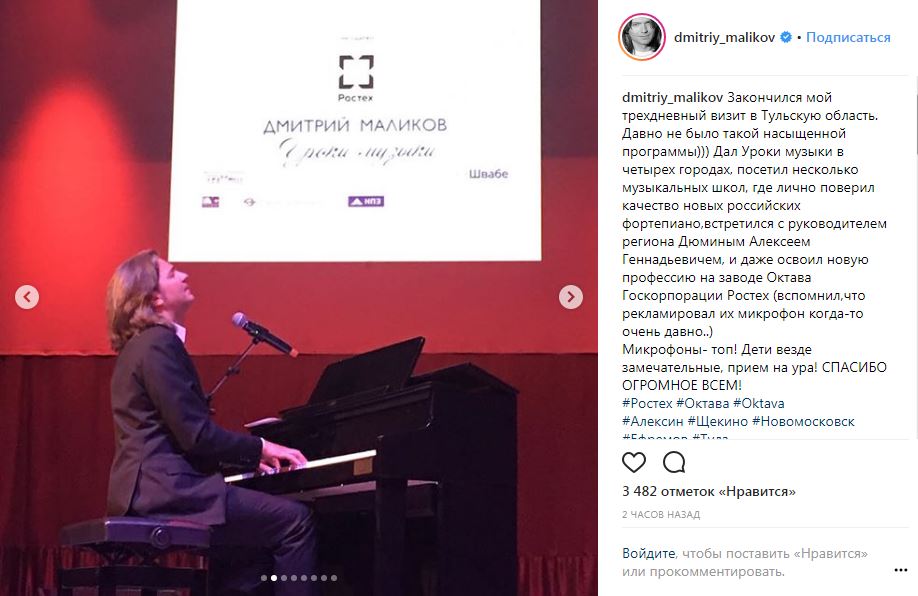 Певец Дмитрий Маликов, занимающийся популяризацией классической музыки, рассказал о своей поездке в Тульскую область в Instagram.
