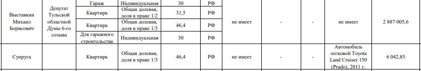 В соответствии с требованиями законодательства депутат Тульской областной Думы Михаил Выставкин отчитался об имуществе в собственности и доходах за 2017-й год.