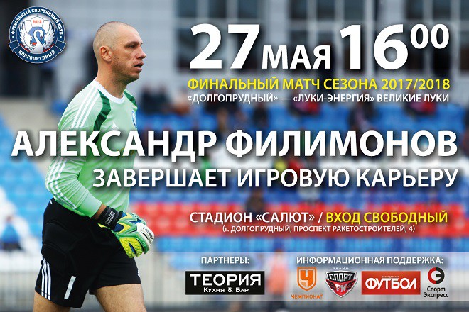 27 мая Филимонов проведет заключительный мат в своей вратарской карьере. Он пройдет в подмосковном Долгопрудном на стадионе «Салют». местный клуб сыграет против «Луки-Энергия» в рамках первенства ПФЛ в группе «Запад».