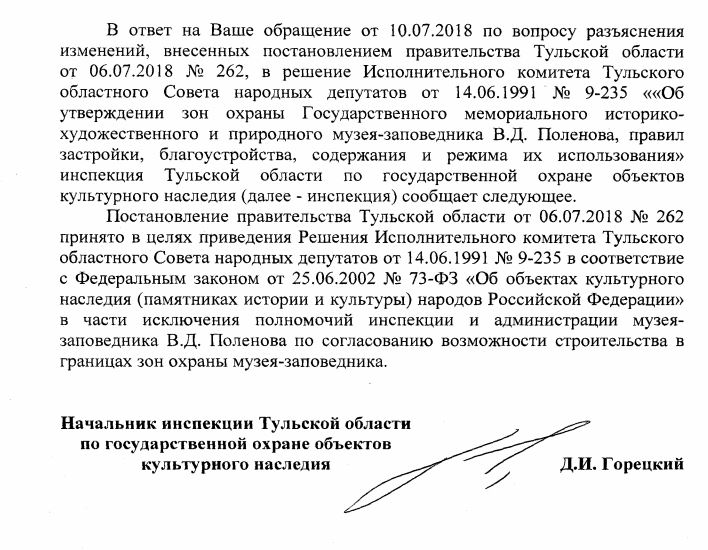Начальник инспекции по государственной охране объектов культурного наследия Денис Горецкий прокомментировал «Тульской прессе» Постановление правительства региона по музея-заповеднику «Поленово».