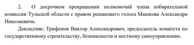 12 июля состоится 54-е заседание Тульской областной Думы, в ходе которого рассмотрят вопрос досрочного прекращения полномочий заместителя председателя избиркома Александра Машкова.