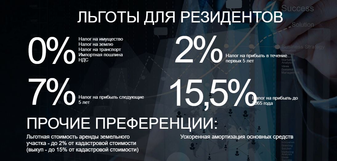 - Полное освобождение от уплаты налога на имущество в первые пять лет, на шестой и седьмой годы плата составит 1,1%, с восьмого по десятый год – 1,5 %;