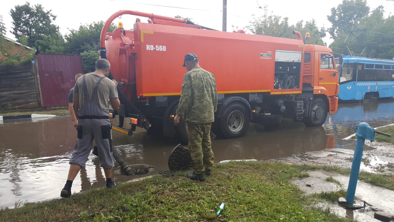 Руководители территориальных округов занимаются инспектированием улиц после сильного ливня. В частности, уделяется особое внимание ливневой канализации. На перекрестке улицы Ленина и улицы Коминтерна работает каналопромывочная машина.