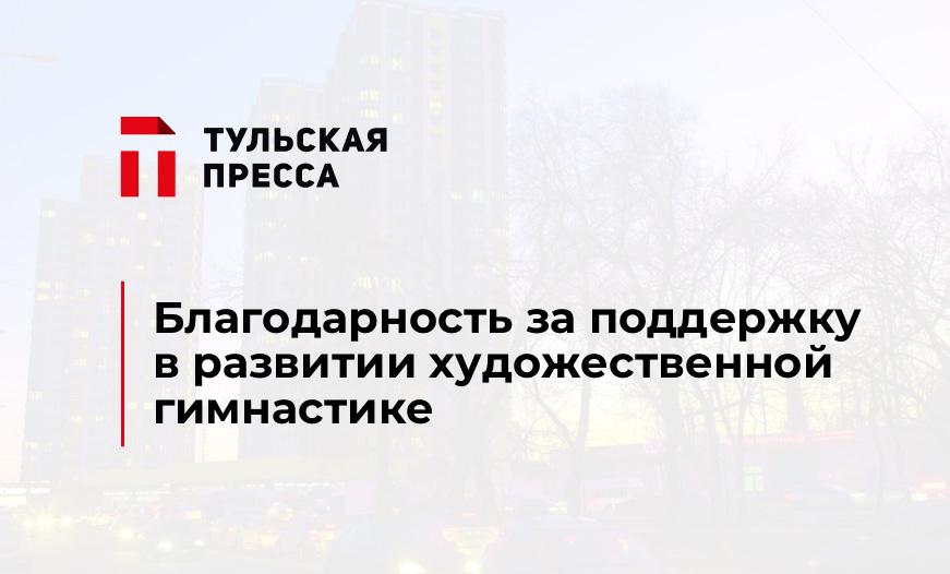 От имени городской федерации художественной гимнастики благодарственные письма за помощь и поддержку в развитии этого прекрасного вида спорта в Туле были вручены депутату Государственной Думы, вице-президенту Всероссийской федерации художественной гимнастики Александру Брыксину, депутату Государственной Думы Владимиру Афонскому, учредителю ООО «Автокласс Плюс» Александру Иванову и руководителю ООО «VS GROUPS» Ольге Дыдыко.