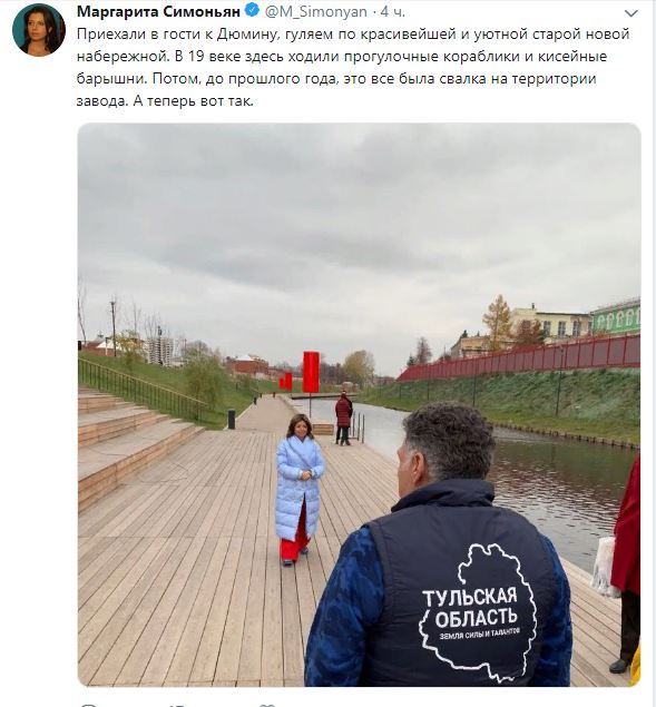 «Обещают настроить еще тут кафешек, а зимой — каток. Обязательно приезжайте погулять по модной и уютной новой Туле. Мы доехали за два с половиной часа», — написала Симоньян на своей странице в соцсети.