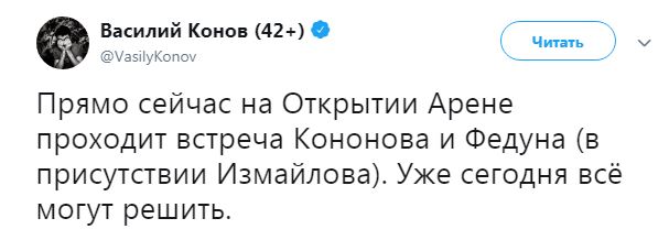 О встрече Кононова и Федуна сообщил журналист Василий Конов в Твиттере: «Прямо сейчас на Открытии Арене проходит встреча Кононова и Федуна (в присутствии Измайлова). Уже сегодня всё могут решить».