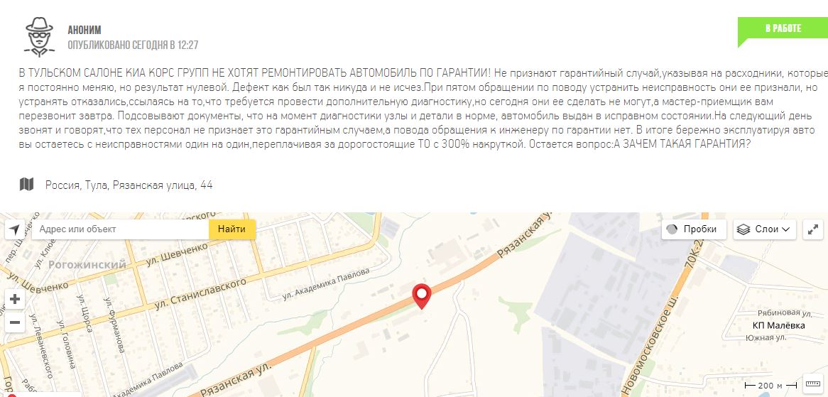 На популярном у туляков интернет-ресурсе Zadolbalo разместили жалобу на обслуживание в автосалоне «Киа».