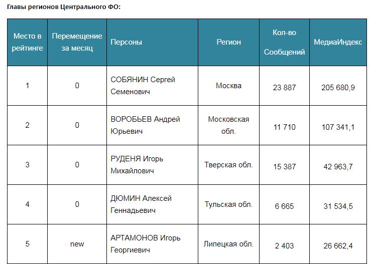 Глава региона по-прежнему на четвертом месте в медиарейтинге за октябрь среди глав субъектов ЦФО.