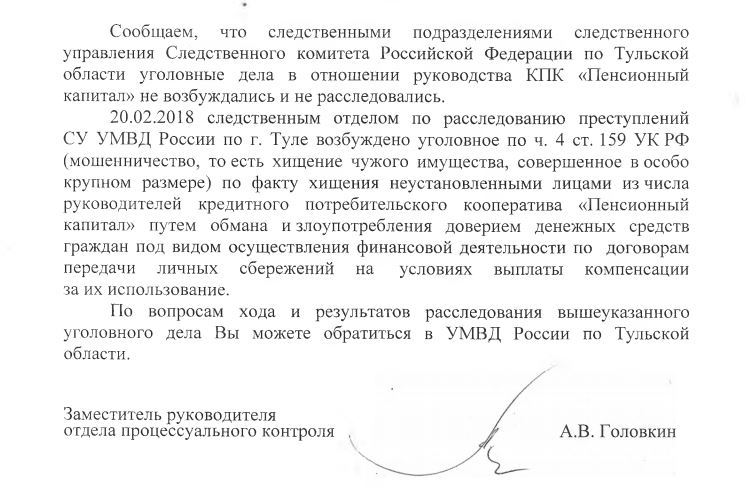 Читатели «Тульской прессы» попросили нас разузнать, как продвигается расследование по делу КПК «Пенсионный капитал» — напомним, ведется расследование о мошенничестве организации, оставившей без денег сотни пайщиков по всей стране.