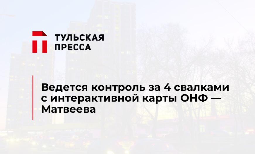 Корреспондент «Тульской прессы» передает, что на контроле управления Матвеевой находятся четыре свалки, нанесённые на интерактивную карту ОНФ. Они расположены в поселке Барсуки, а также на городских улицах Столетова, Перекопской и Криволученской.