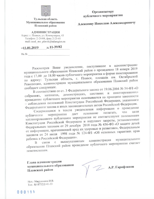 Он опубликовал официальные ответы от глав администраций Алексинского и Плавского районов, которые отклонили его просьбу о проведении мероприятия, ссылаясь на федеральный закон о запрете пропаганды нетрадиционных сексуальных отношений среди несовершеннолетних.