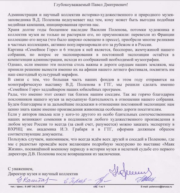 Руководство и сотрудники музея «Поленово» прокомментировали редакции «Тульской прессы» информацию о пропаже картины «Семейное горе» и шести этюдов.