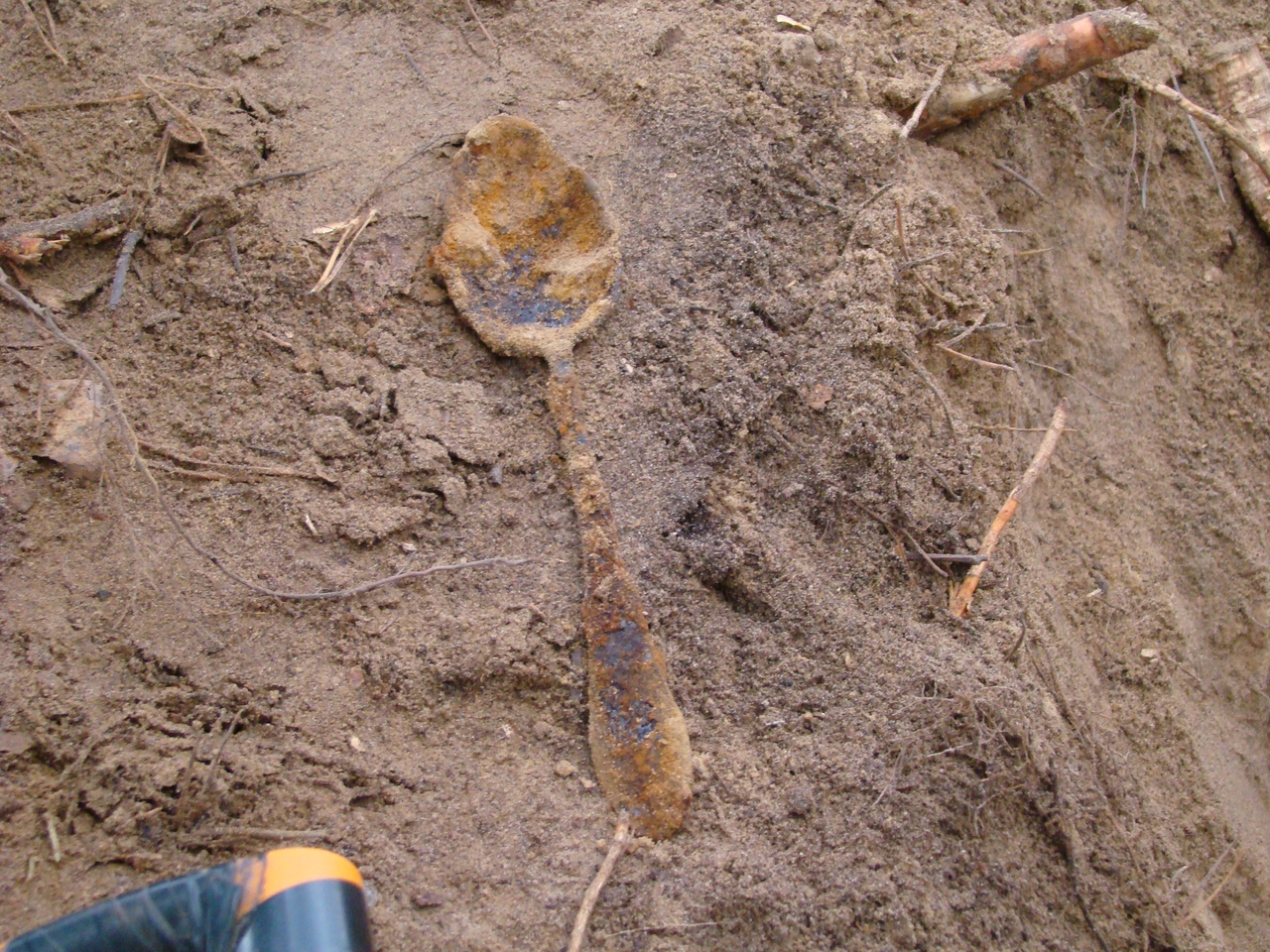 При нем не нашлось личных вещей, не было медальона: только пуговички от шинели и ложка. Местные жители сказали ещё, что при нём было письмо без адреса на имя Татьяны. Ложку попробуем зачистить в лаборатории, она уже ржавая, так что сложно увидеть, есть ли там какие-то надписи. Обычно у бойцов были с собой алюминиевые ложки, а это стальная — нестандартная.