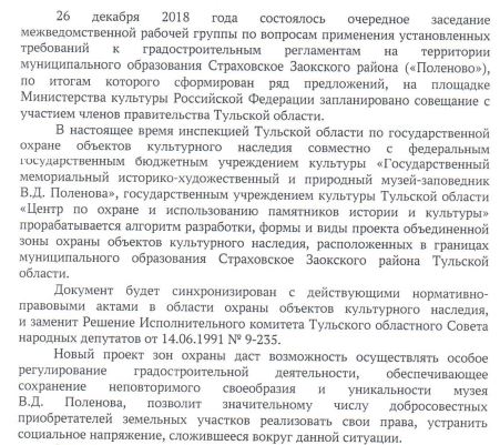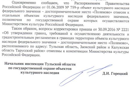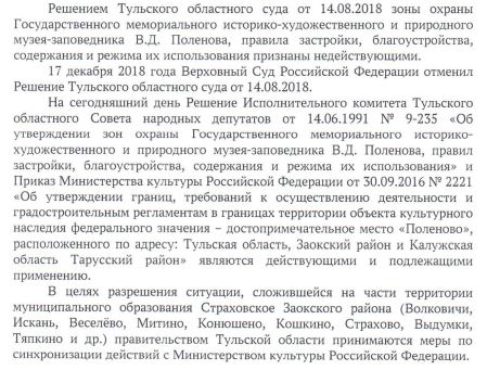 По многочисленным просьбам наших читателей, «Тульская пресса» поинтересовалась у начальника Инспекции Тульской области по государственной охране объектов культурного наследия Дениса Горецкого, как сейчас обстоит дело с пересмотром границ и режимов достопримечательного места «Поленово».