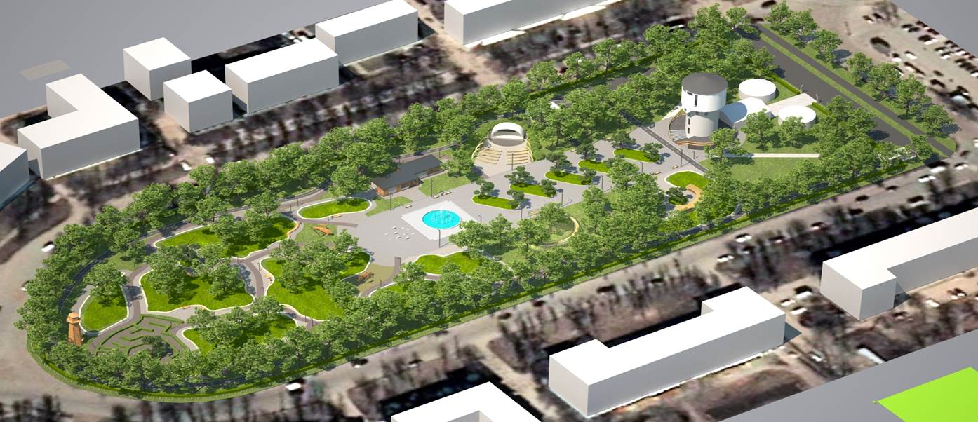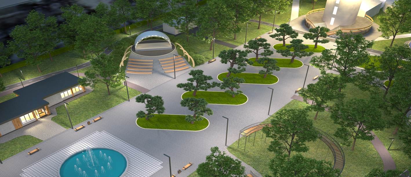 В 2020-м году во второй зоне общественного пространства будут также выполнены демонтажные работы, озеленение, асфальтирование, уложено плиточное покрытие, установлены скамейки, урны, ограждения со светящимися арками. Смонтируют новый фонтан с подсветкой и арт-объекты (смотровая винтовая площадка, теневой навес). Кафе и водонапорную башню также планируют реконструировать, сделать подсветку.