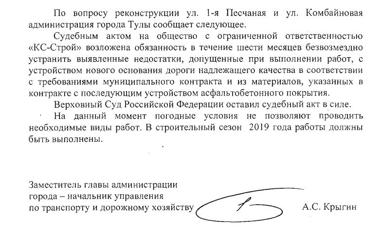 Начальник управления по транспорту и дорожному хозяйству администрации Тулы Алексей Крыгин пояснил судьбу проезжей части по улице 1-я Песчаная.
