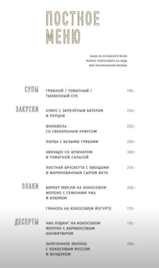 В «Культуре» тоже подготовили специальное постное меню для своих гостей. Правда, видимо, решили не заморачиваться и показали только его краешек и то на фото. Полноценную версию постного меню ни в аккаунтах ,ни на сайте ресторана нам найти, увы, не удалось. Но судя по фотографии, на которой представлено семь блюд, и это только из раздела «Горячее», можно предположить, что постное меню довольно обширное по позициям.