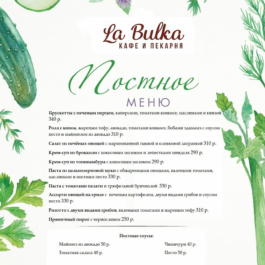 La Bulka присоединилась к тульским ресторанам, предлагающим постное меню. Позиций не так много, но есть и супы, и салаты, и горячее — просто и изыскано. Из особенностей: пряничный пирог с черносливом на десерт и специальные постные соусы, есть даже майонез из авокадо.
