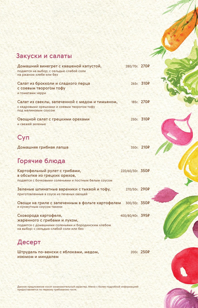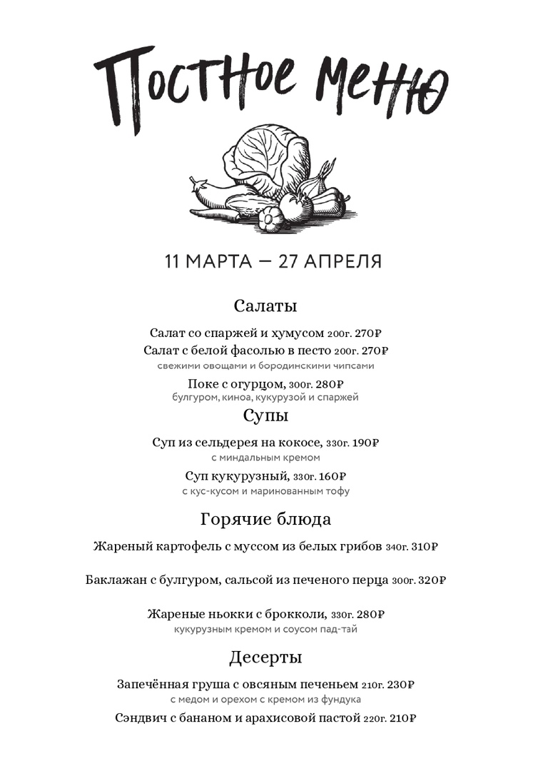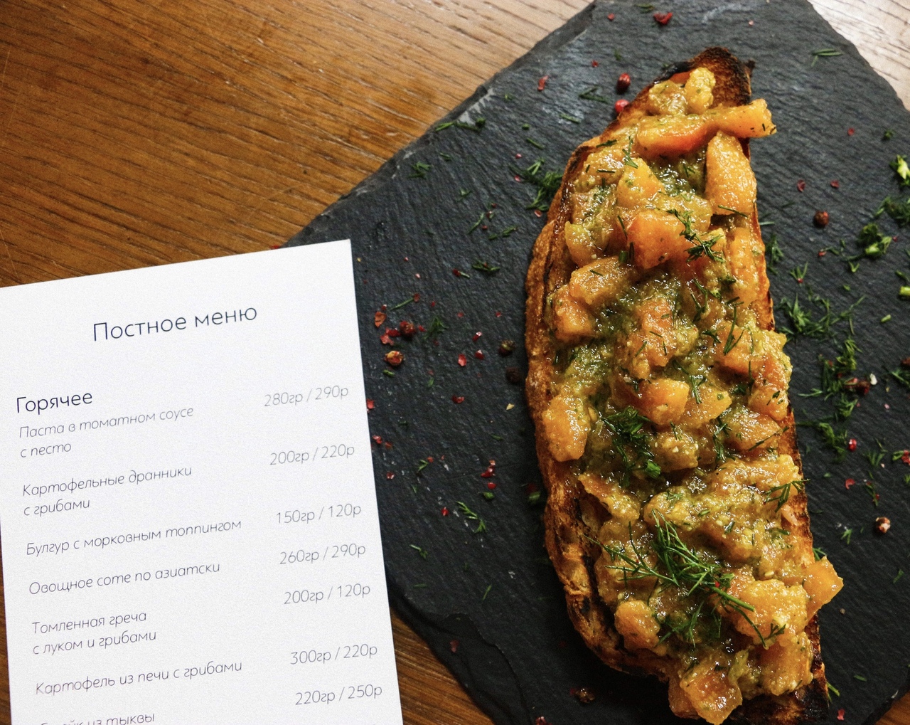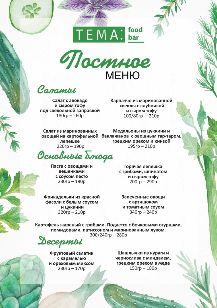 «Великий пост — большое и важное испытание, которое мы постарались сделать максимально разнообразным и содержательным и придумали для вас постное меню из овощей, грибов, злаков, фруктов и ягод», — говорится на страничке «Темы». Меню, и правда, хорошее, жаль, в нём нет супов. Зато можно попробовать шашлычки из кураги и чернослива с миндалем и грецким орехом в меде. А ещё есть альтернатива мясу в виду медальонов из цукини и баклажанов, карпаччо из свёклы и фрикадельки из красной фасоли.