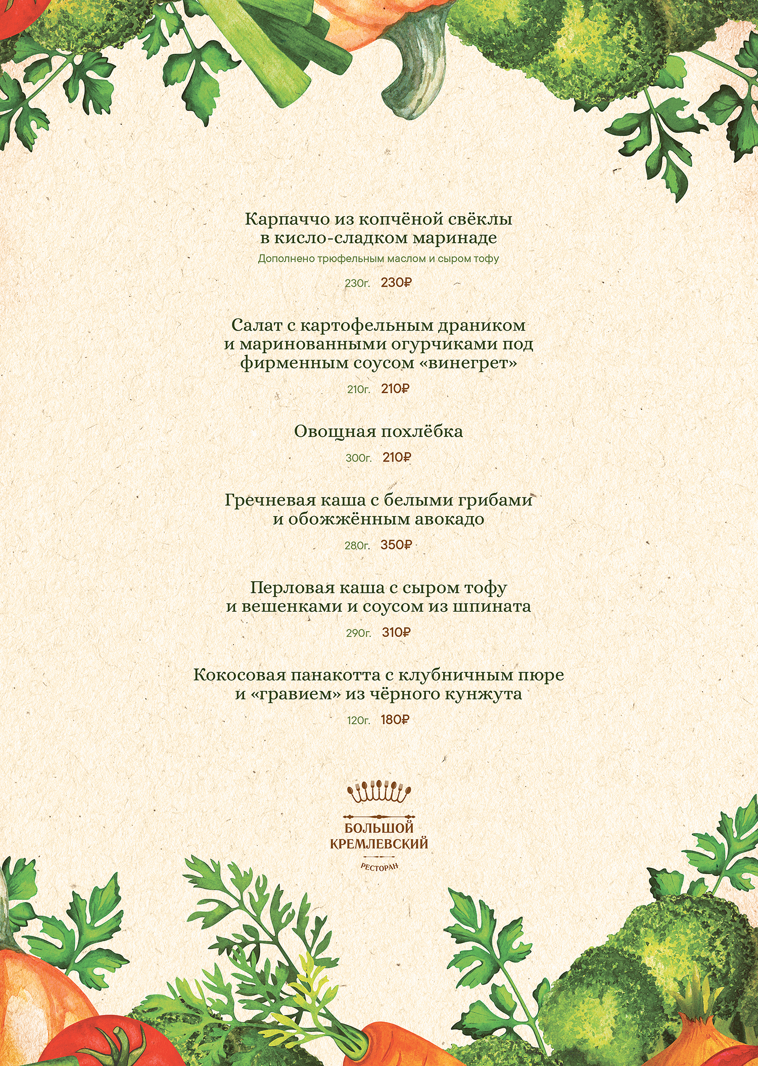 «Мы приготовили специальное постное меню, в которое включили вкуснейшие салаты, яркие горячие блюда, а также специальный десерт от шеф- повара», — пишут на страничке в соцсетях «Большого Кремлёвского». Здесь тебе и перловка с тофу, и гречка с белыми грибами, и овощная похлёбка. А на десерт — кокосовая панакотта с клубничным пюре и «гравием» из чёрного кунжута». По-барски.