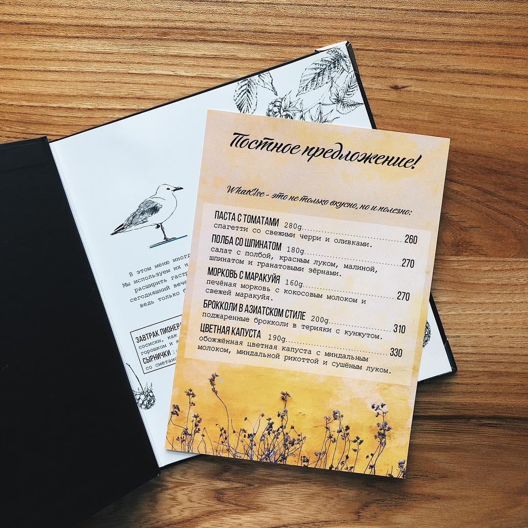 «Наше меню и так радует вегетарианцев и любителей правильного питания, но постное предложение никто не отменял!» — пишут представители WhatElse? в своём аккаунте. И то правда. Постное меню небольшое: всего пять позиций, зато каких. Гастро-бистро, известное в Туле своими кулинарными экспериментами, и в специальном меню решило поиграть с вкусовыми ощущениями своих посетителей. Самым необычным, пожалуй, стал салат полбой, красным луком, малиной, шпинатом и гранатовыми зёрнами.