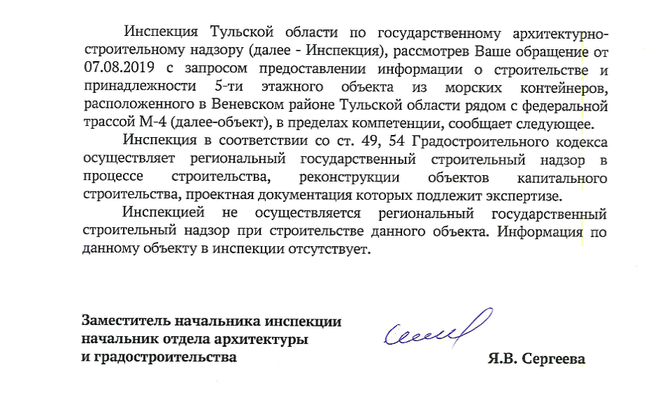 «Инспекция Тульской области по государственному архитектурно-строительному надзору, рассмотрев Ваше обращение с запросом предоставления информации о строительстве и принадлежности 5-этажного объекта из морских контейнеров, расположенного в Веневском районе Тульской области рядом с федеральной трассой М-4, в пределах компетенции сообщает следующее.