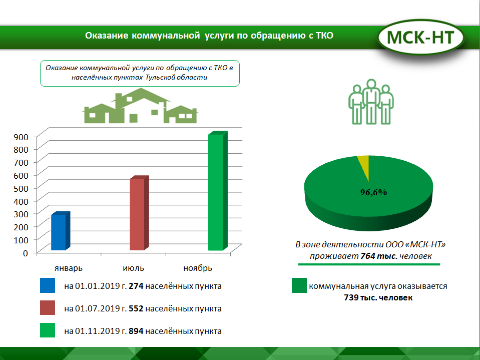 По её словам, всего за 10 месяцев региональный оператор значительно увеличили охват населенных пунктов, где предоставляется коммунальная услуга по обращению с ТКО. Если в январе вывоз ТКО был налажен только в 274 городах и поселках, то в июле эта цифра увеличилась более чем в два раза, а на ноябрь она составляет уже 894 населённых пункта. ООО «МСК-НТ» обслуживает почти 740 тыс. жителей, которые проживают в его зоне деятельности.