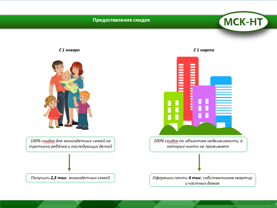 Компания социально ориентирована. С 1 января предоставляется стопроцентная скидка для многодетных семей на третьего ребёнка и последующих детей. На сегодняшний день её получила 2321 многодетная семья. С 1 марта предоставляется стопроцентная скидка по объектам недвижимости, в которых никто не проживает. Эту скидку на сегодняшний день оформили собственники почти 4 тысяч квартир и частных домов. Как и где оформить эти скидки можно узнать на сайте ООО «МСК-НТ», в офисах регоператора и по телефону – 8 (4872) 570-777.