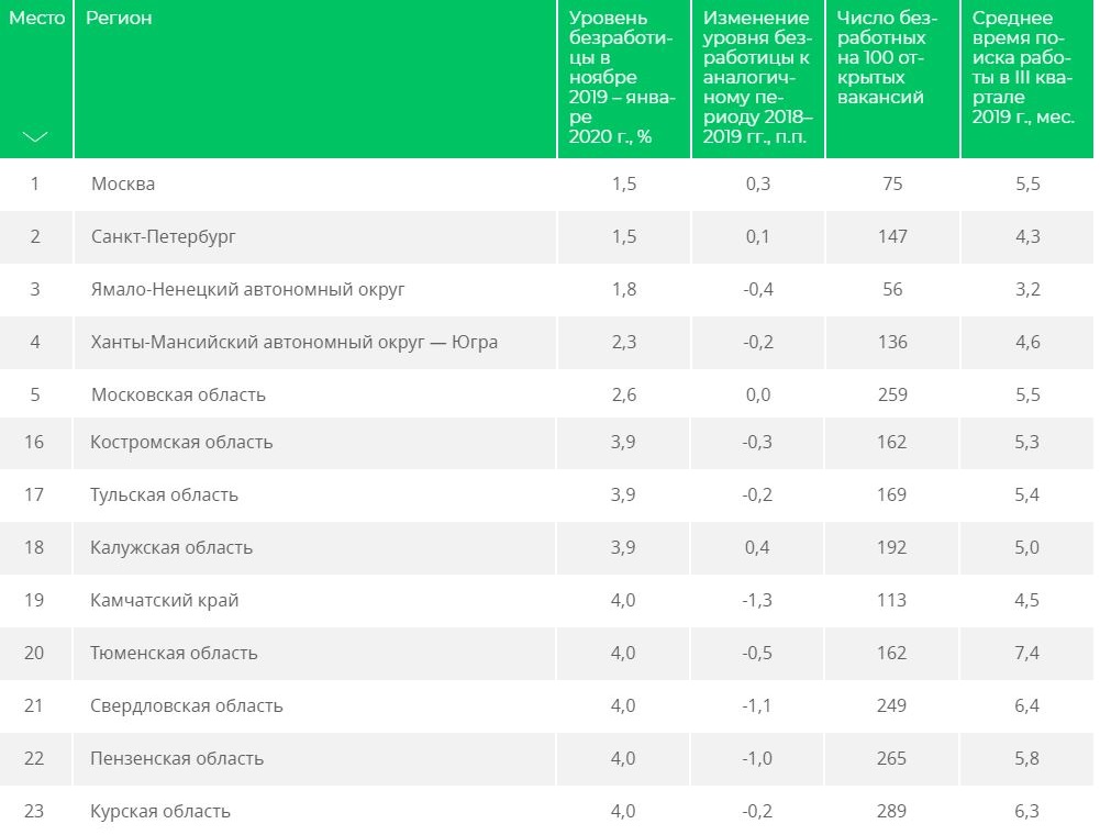 В России составили рейтинг регионов по уровню безработицы: как оказалось, самый низкий уровень в стране по итогам ноября 2019-го — января 2020 года в Москве и Санкт-Петербурге и Ямало-Ненецком АО. Хуже всего дела обстоят на Северном Кавказе.