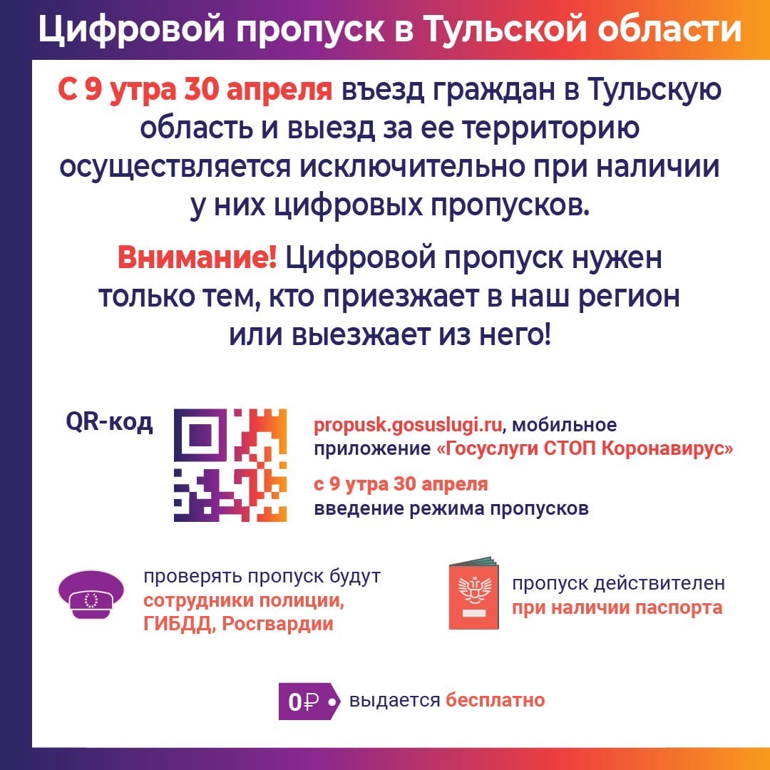 С 9 утра 30 апреля в Тульской области вводится режим цифровых пропусков, без которых въехать в регион или покинуть его станет невозможно. Пропуска можно предъявить как в электронном (на экране гаджета), так и в бумажном виде.