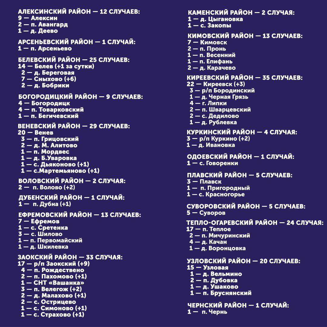 К 25 апреля коронавирус охватил всю Тульскую область — если по данным на пятницу «чистыми» оставались Дубенский, Чернский и Воловский районы, то в субботу стало известно о случаях заражения в там. В Дубенском и Чернском районах заболело по одному человеку, в Воловском районе двое инфицированных.
