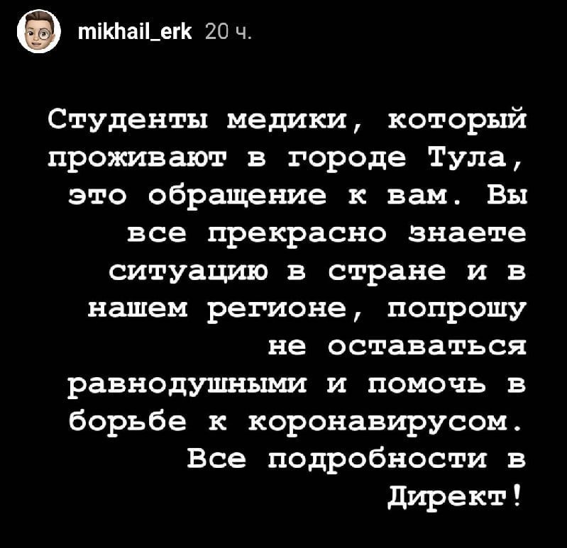 Сын министра здравоохранения Тульской области Алексея Эрка Михаил призывает студентов-медиков помочь в борьбе с коронавирусной инфекцией. Обращение молодой человек опубликовал в своих соцсетях.