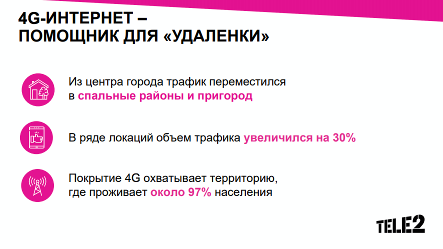 Денис Маликов объяснил это тем, что с переводом жителей на удаленную работу поменялась и модель потребления. «Если раньше основной интернет-трафик в будние дни приходился на центр города, то сейчас он сконцентрирован в спальных районах и за городом – там, где мы расширили покрытие, усилили сигнал и ускорили подключение к сети», — отметил он.