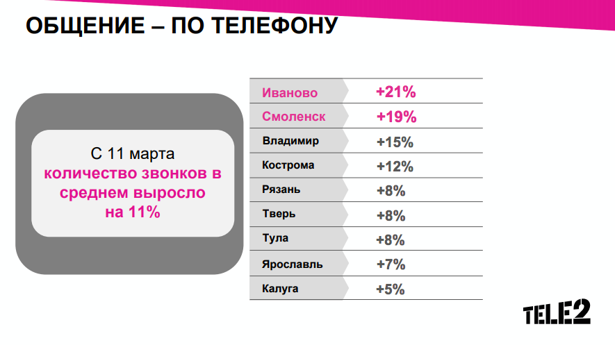 И здесь зафиксирован рост в среднем на 11%, рассказал Денис Маликов. Рекордсменом с показателем в 21% стал Ивановский регион, на втором месте – с 19%, Смоленск. Но если Смоленск всегда был характерен любовью жителей именно к телефонным разговорам, то для Иванова такое в целом впервые.