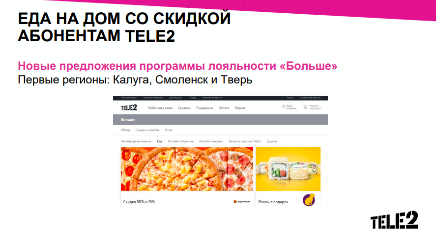 Чтобы поддержать всех тех, кто остался дома, оператор начал запускать новые предложения программы лояльности «Больше». Теперь абоненты в трех регионах – Калуге, Смоленске и Твери, могут заказать ресторанную еду на дом со скидкой до 50%. Промокоды на скидку доступны в приложении «Мой Tele2» на смартфоне или на сайте оператора. Сейчас в компании работают над тем, чтобы расширить программу на остальные области.